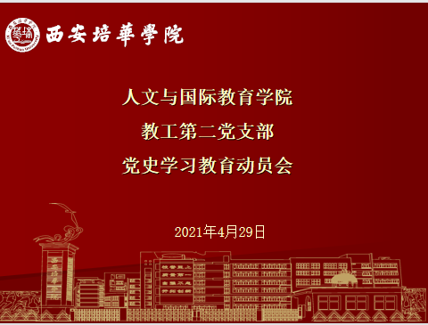 2021年4月29日,人文与国际教育学院教工第二党支部党史学习教育动员会在格物楼第四会议室举行,西安培华学院党委书记罗新远、人文与国际教育学院党委书记兼行政副院长王飞、人文与国际教育学院教工第二党支部书记赵洁及教工第二党支部所有党员出席会议。会议由党支部书记赵洁主持。