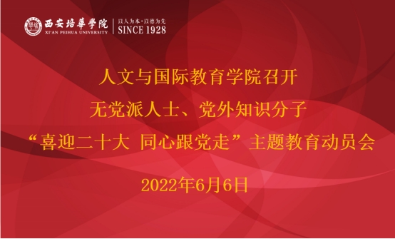 6月6日下午17点,人文与国际教育学院党委在格物楼第四会议室召开了学院无党派人士、党外知识分子开展“喜迎二十大 同心跟党走”主题教育动员会。人文与国际教育学院党委书记、行政副院长王飞主持会议,民盟西安培华学院主委、西安培华学院归国华侨联合会副主席曹长春、人文与国际教育学院无党派人士代表付丽伟、学院党委副书记王冰以及全体党支部书记参加会议。