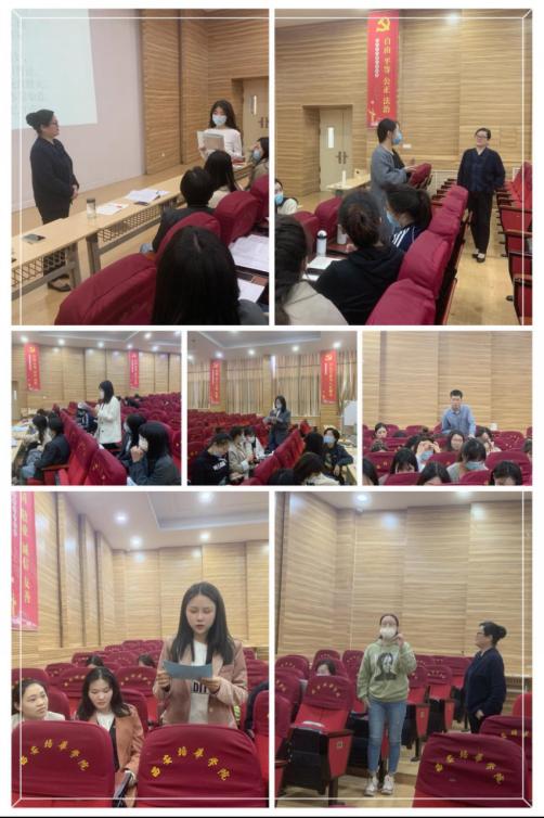 培训的最后一个环节,胡老师设计了一场头脑风暴,帮助青年教师理解今天所讲的内容。活动要求青年教师按专业分为5-6人一组,让教师对自己专业的学情进行分析,设计一节以学习为中心的课,每组安排一名教师做笔记,活动结束后进行汇报,课程内容为白居易的《忆江南》。法学专业的老师结合自己学科重逻辑、重证据的特点,认为诗歌可以教给学生如何阐述论点并用论据支持;学前教育专业的老师从诗歌中找出了适合幼儿的知识与情感目标;中文系的老师从诗的理解和欣赏层面切入,并挖掘出生态审美等课程思政元素;英语专业从翻译和口语方面设定了课程目标并设计了课堂活动的主要内容;日语专业老师则认本诗可以与日本的诗歌进行对比。在这个活动中,青年教师积极参与,并且都从中得到了启发。