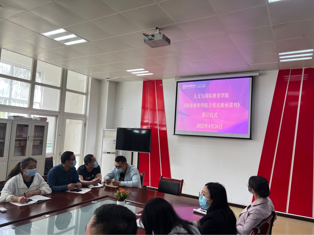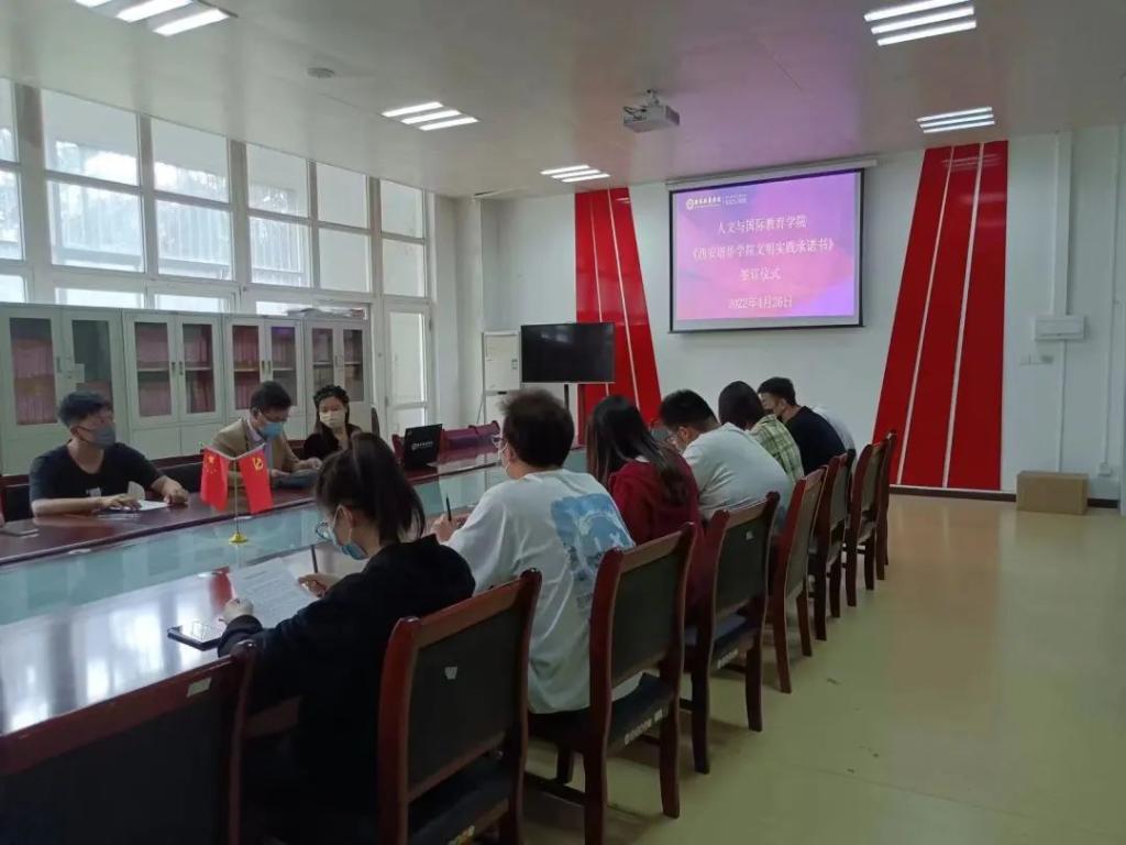 为培育和践行社会主义核心价值观,将习近平总书记关于精神文明建设的重要论述贯穿于校园文明实践的全过程,不断提高全体师生的道德素质和文明素养,争做文明实践行动的倡导者、践行者、引领者。我院于4月26日在第四会议室开展了《西安培华学院文明实践承诺书》签约仪式,参会人员有教师代表和学生代表,本次签约仪式号召全体师生做到以下几点:
