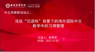 2022年4月20日下午两点至四点,中文系召开了以“浅谈‘汉语热’背景下的海外国际中文教学中的习得管理”为主题的教学研讨活动,旨在让教师们更好地了解海外中文教学的特点,开阔国际化教学视角,深刻认识海外学生习得管理特质,从而在教学及科研中获取更多研究技巧和方法。本次会议在腾讯会议平台召开,邀请到朱君芝教师主讲,中文系主任付丽伟副教授主持,中文系全体教师参加了此次教学研讨活动。