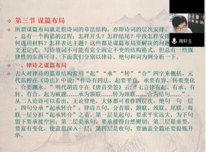 随后,李教授主要抓住下编诗词创作方法与技巧中的“谋篇布局”展开了详细讨论,通过列举诸多名家名诗的作品,依次分享了诗歌创作中“起-承-转-合”的方法。讲述中李教授再三强调“承”与“转”的难点与重要性,并结合杜甫的《蜀相》《登楼》、元好问的《秋怀》等诗词的创作背景和诗歌结构详细分析了“承”与“转”的关系与方法。
