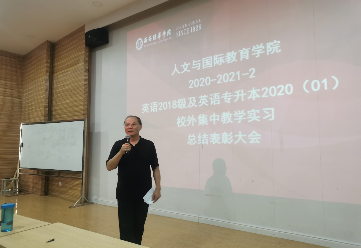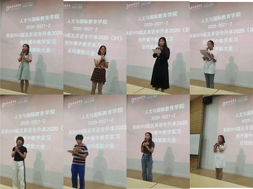 昨天下午五点,我系英语专业18级英语及专升本2020(01)所有教育方向参加校外实习的学生与带队老师于J101教室召开了本次校外集中教学实习总结表彰大会。首先由甘世安教授进行总结发言,他总结了此次整个实习工作的各个方面的安排与成果,提出此次12所学校对本专业实习生的肯定,如返餐费,请学生吃饭以及给学生发奖品等,有的甚至给学生送来对学生实习工作肯定的字画,这些都是对英语专业教育方向实习学生的十足肯定;另外,甘教授通过此次实习的各种情况对学生们提出了殷切希望,希望通过实习所得更好地为将来的就业做好准备,前程似锦。