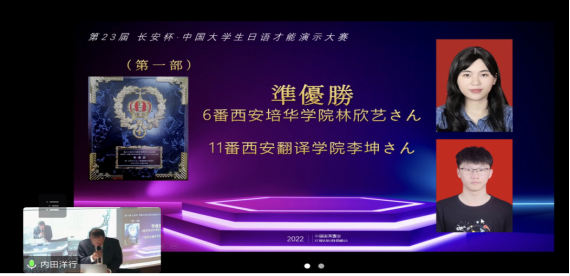 2022年10月29日举行的第二十三届长安杯·中国大学生日语才能演示大赛由中日人文交流大学联盟、中国日语教学研究会、西安外国语大学联合主办主办,受到中国教育国际交流协会、陕西省教育厅、日本文部科学省、日本京都府等单位的大力支持。本届大会采用线上方式进行大,中日两国会场同步,实时观看,日本专家现场评审。