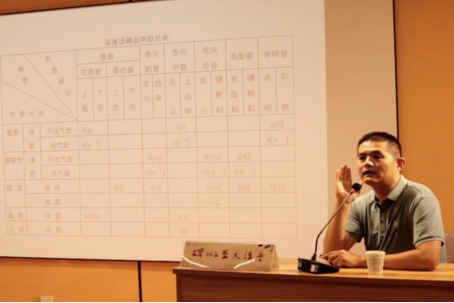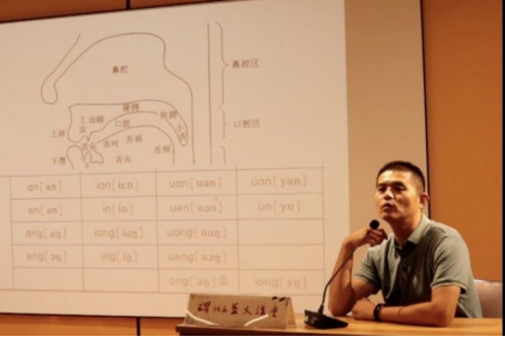 王增智副教授以他多年的专业语言学专业知识和丰富普通话教学经验,从“音准与音美”、“音美是发音的优美程度”以及“音准共鸣腔、弹性美、语势美”三个部分讲解与介绍音准与音。他指出音调是普通话音节高低升降变化的形式,有区别意义的作用,音姿则是发音时发音器官所呈现的姿态。王增智副教师强调,在发音的过程中应注意音节美、共鸣美、弹性美、语姿美,同时还应该注意字头要叼住弹起、字腹要拉开立起、字尾要列位弱收、发音要呈枣核型。