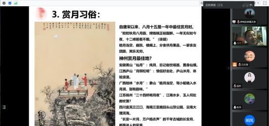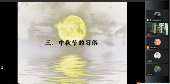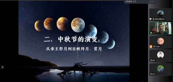 最后,闫建滨教授对中秋节习俗的形成及其文化内涵进行讲解,如月饼习俗的形成有唐、宋、元、明等不同说法。自唐宋以来,八月十五是一年中的最佳赏月时成为传统,并与大家分享了各地不同的特色习俗。