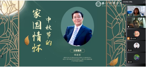 2022年9月9日下午14:00点到16:00点,人文与国际教育学院中文系举办“中秋节的家国情怀”的线上讲座,特邀陕西节庆文化促进会会长、西安文史馆研究员、西北大学中国节庆文化研究中心副主任闫建滨教授为主讲嘉宾,讲座由中文系副主任罗妮老师主持,中文系全体教师及20级、21级学生代表参加本次讲座。