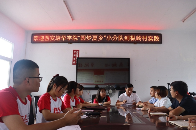 8月6日,西安培华学院“三下乡社会实践基地”挂牌仪式在涧池镇枞岭村村民委员会举行。西安培华学院人文与国际教育学院团委书记朱林鹏老师于中午抵达枞岭村村委会,同枞岭村村委会领导班子及圆梦夏乡实践队开展会议。