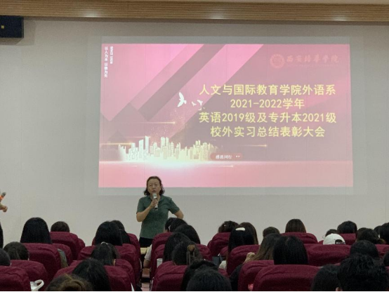 2022年7月1日中午12:30,外语系英语专业2019级及专升本2021级校外实习总结表彰大会在2号教学楼J202召开。外语系副主任周萍老师、英语教育方向和商务英语方向各班实践带队教师出席,英语专业2019级、2021级专升本共计270余名学生参加会议。会议由教育方向实践负责人曹明老师主持。