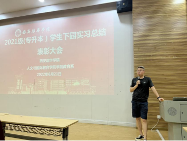 为总结经验、激励先进、树立典型,进一步推动学前教育系实习及其他各项工作持续健康发展,2022年6月21日,西安培华学院人文与国际教育学院学前教育系在格物楼J101阶梯教室隆重召开2021级(专升本)学生下园实习总结表彰大会,由学前教育系副主任栾博强老师主持,带队教师和21级专升本4个班级学生参加会议。