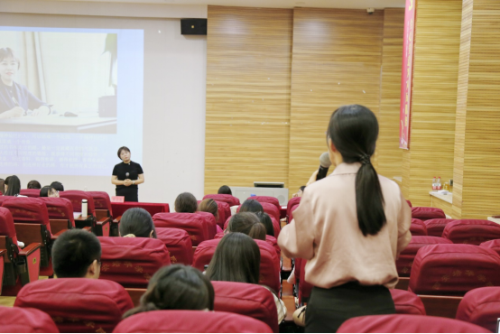 首先,人文与国际教育学院常务副院长梁蕊副教授致辞。梁院长对刘校长的到来表示热烈欢迎,并指出在中文系为接轨用人单位对人才的需求,培养一专多能的应用型复合型人才的背景下,迫切期待像刘校长这样的一线名师,为我们的师生提供方法和指明方向。