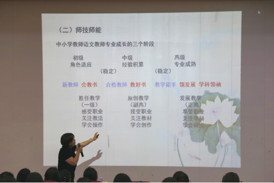 接着,刘校长从师德师风、师技师能、师文师识三个方面阐述了成为一名语文教师所需要的专业素养。刘校长强调,作为一名教师,第一要素是要有“师德”,要有敬畏之心,并总结了新时代语文教师所需具有的职业精神,明确了好老师的标准。同时,刘校长结合一线教学经验,生动形象地为在座师生讲解如何备好课,上好课,进而打磨成精品课,其中以《闻官军收河南河北》为例,详细剖析了古诗五步教学法(查、读、明、悟、诵)。此外,刘校长还强调,新时代教师要持续学习,并具有文学、艺术、沟通等多方面的素养。