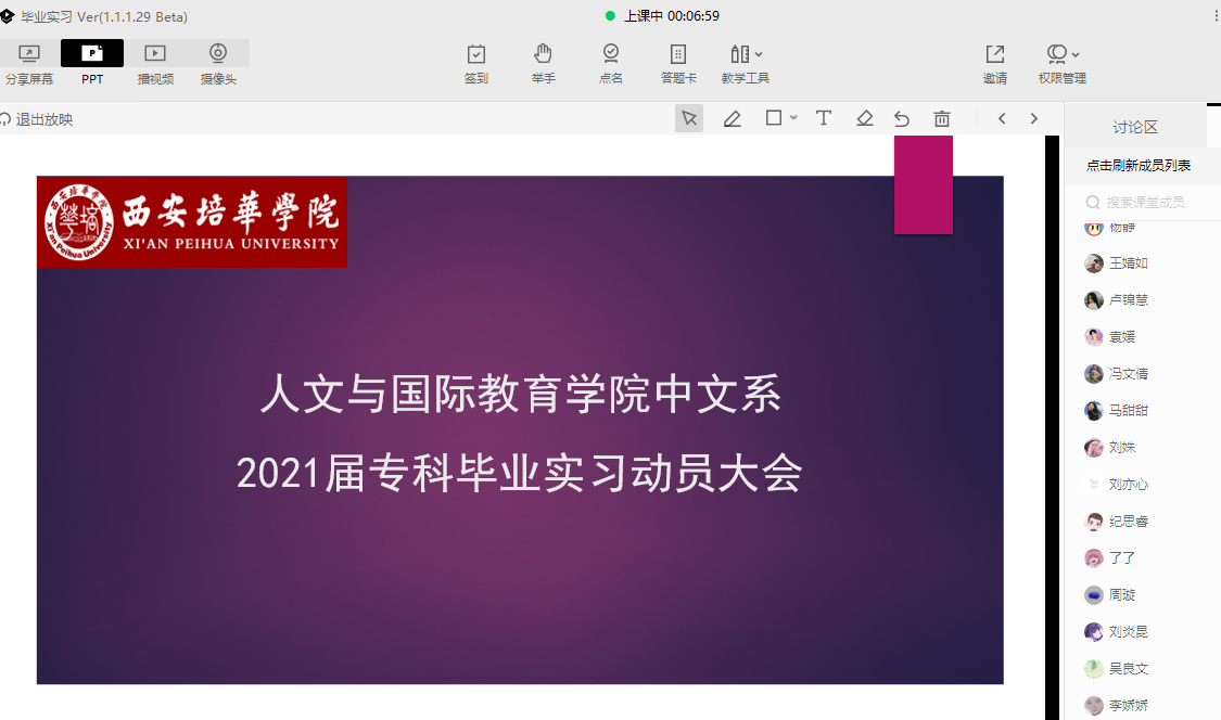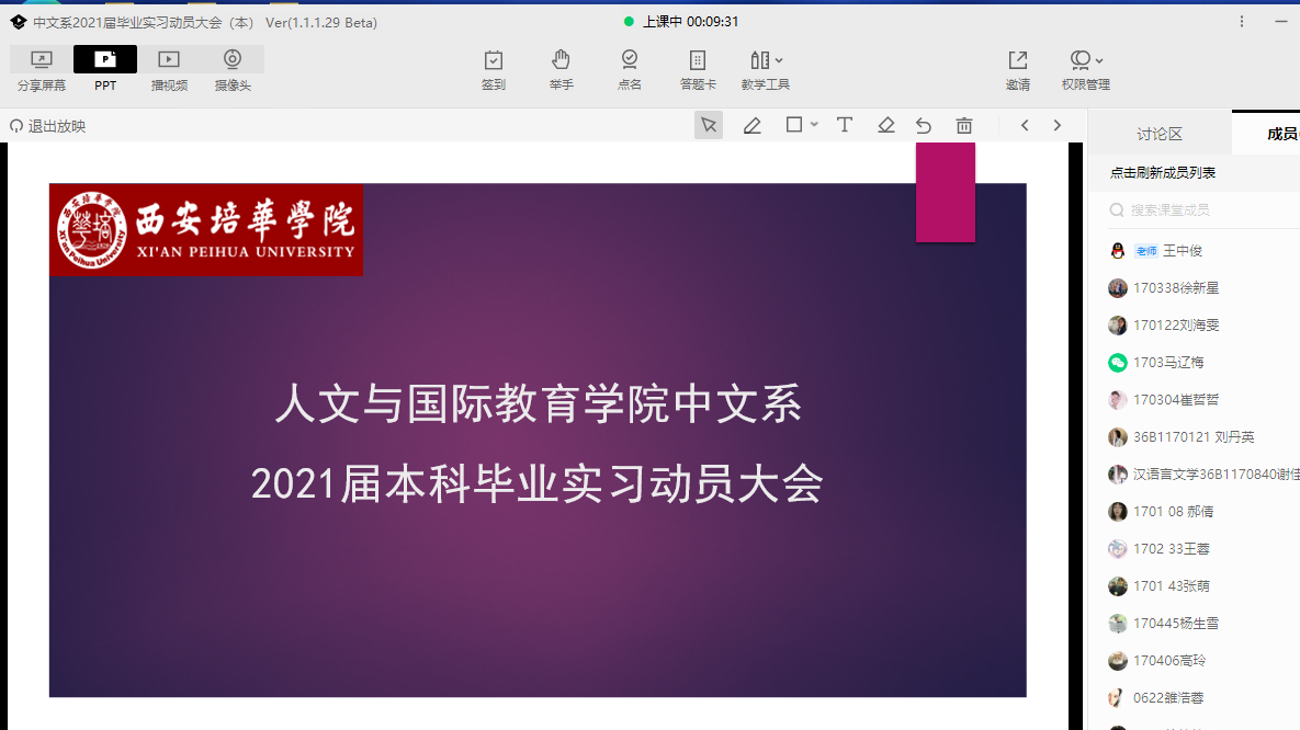 根据2021届中文系汉语言文学及汉语专业人才培养方案要求与《关于做好2021届毕业生毕业实习工作的通知》(培华教函〔2020〕79号)的规定,2020年12月18日中午12—13点召开了毕业实习动员大会,因为疫情原因,本年度动员大会改为线上腾讯课堂进行,中文系副主任罗妮老师、汉语专科负责人王玉玲老师、负责本次毕业实习的相关老师以及2021届全体毕业生参与了此次会议。
