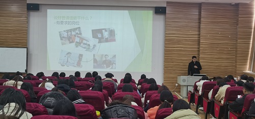 接下来,王增智老师从为什么要说好普通话、说好普通话能干什么、怎么说好普通话三个方面为同学们进行了的讲解。王老师强调了说好普通话对于提升学生就业成功率的必要性和重要性,督促各位同学认真学习普通话,汲取技巧,争取打赢职业规划这一战。讲解过程中王老师也穿插了一些专业内容,带领同学们从理论知识入手,深入讲解了方言与普通话的关系。王老师进一步讲述了普通话以及方言对当代社会发展的影响,提醒同学们要想更好考取普通话证需要暂时离开方言区,做到不听不说,勤于练习,努力提升自己的普通话水平,为自己的未来就业迈出坚实的一步。