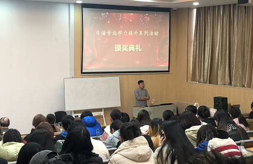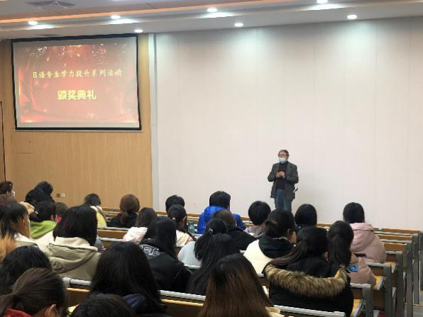 日语专业学科带头人刘建强教授为获奖同学颁奖,并对此次学力提升系列活动做总结致辞。刘建强教授表示,很欣慰看到同学们优秀的作品及表现,今后日语专业将会继续开展各项活动,满足新形势日语学科发展需求,探索多元化应用型外语人才培养模式。