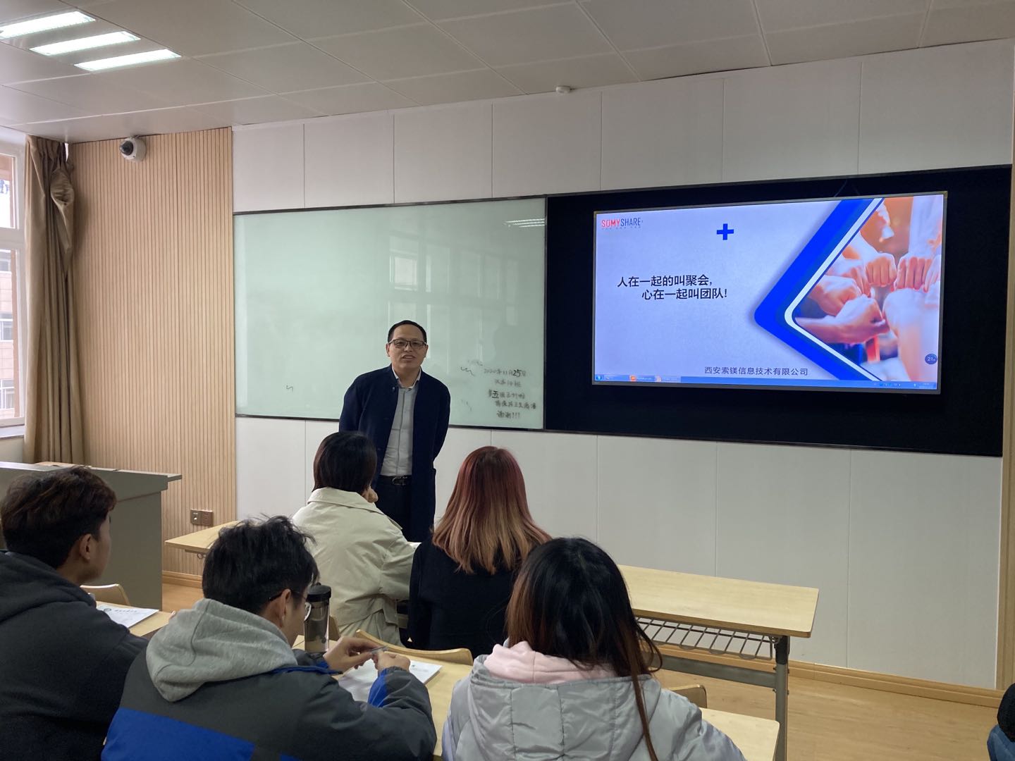 首先,西安索镁信息技术有限公司的贾培良总经理从公司概况、企业文化、企业员工培养模式、企业目前的发展状况及发展前景与同学们作了详尽的分享。在宣讲会的互动环节,同学们也就自己所关心的专业对口、企业所需求的人才素质、公司发展平台与机会等问题与进行了互动交流,公司的各位负责人对大家的提问都一一认真作答,并希望同学们都能找到自我实现的价值与目标,并为之而努力奋斗。宣讲会场面热烈,掌声不断。