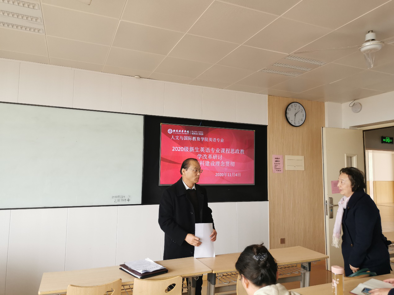 我院英语专业教研室全员18人在甘世安主任的主持下,于2020年11月4日下午13:30-15:30在1501教室召开了英语专业2020级新生英语专业课程思政教学改革研讨及新文科建设理念贯彻的教研会议。教研过程如下: