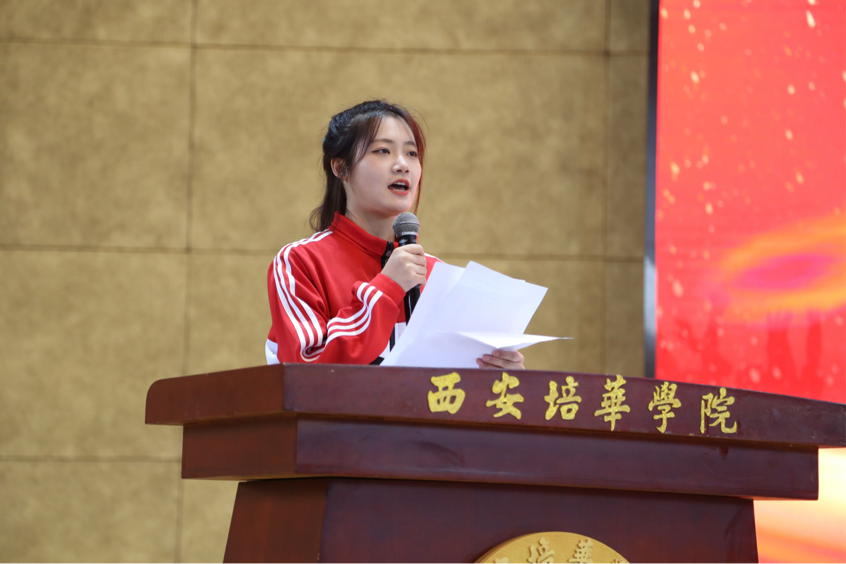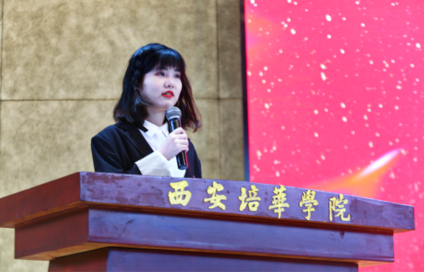 新生代表英语专业殷冰发言,她向同学们分享了自己对大学生活的憧憬,对学校、学院的美好祝愿和对未来的规划和目标。她说到,学习是取得成功的基础,实践是取得成功的源泉,奋斗是取得成功的关键。她希望和同学们共同用青春之我涵养培华精神,用不懈奋斗书写人生华章。