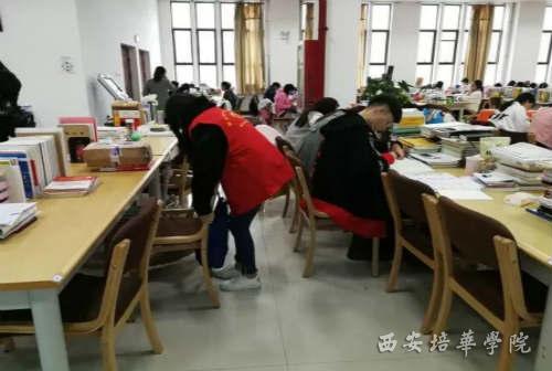 图书馆是与城市的浮华喧嚣迥然不同的充盈着灵动书香的世界,志愿者们在这里整理图书,清洁卫生的同时也感受到图书馆浓厚的文化氛围。你们会看见志愿者们忙碌的身影。为了使同学们有更多的资料参考,他们一直忙碌着上新书,为了使同学们更快的借到图书,他们将归还的书籍整理上书架,为了使同学们有个舒服的环境,他们把图书馆的地面打扫的干干净净。
