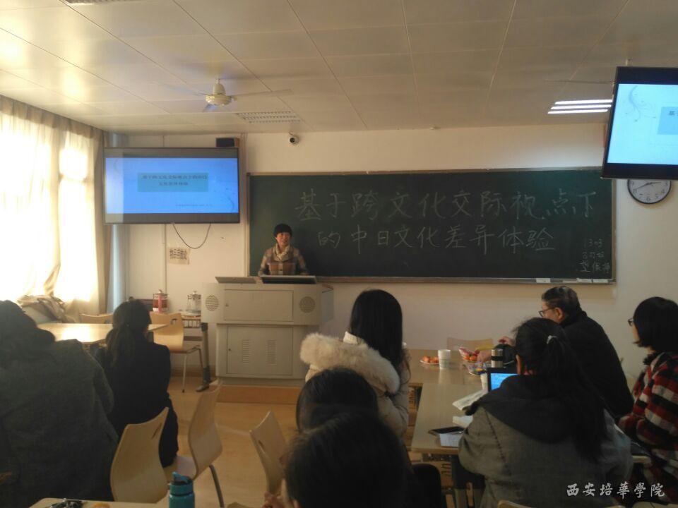 11月21日下午,一场由校教师发展中心主办,旨在扩展教师群体国际视野的的文化沙龙在格物楼1303教室举行。担任本次沙龙主讲的是人文与国际教育学院外语系日语专业的王欣荣教授。题目是“在基于跨文化交际视点下的中日文化差异体验”。日语专业刘建强教授主持,学校九个学院和人文与国际教育学院日语、英语专业的教师及教辅人员约30多人出席了本次沙龙。