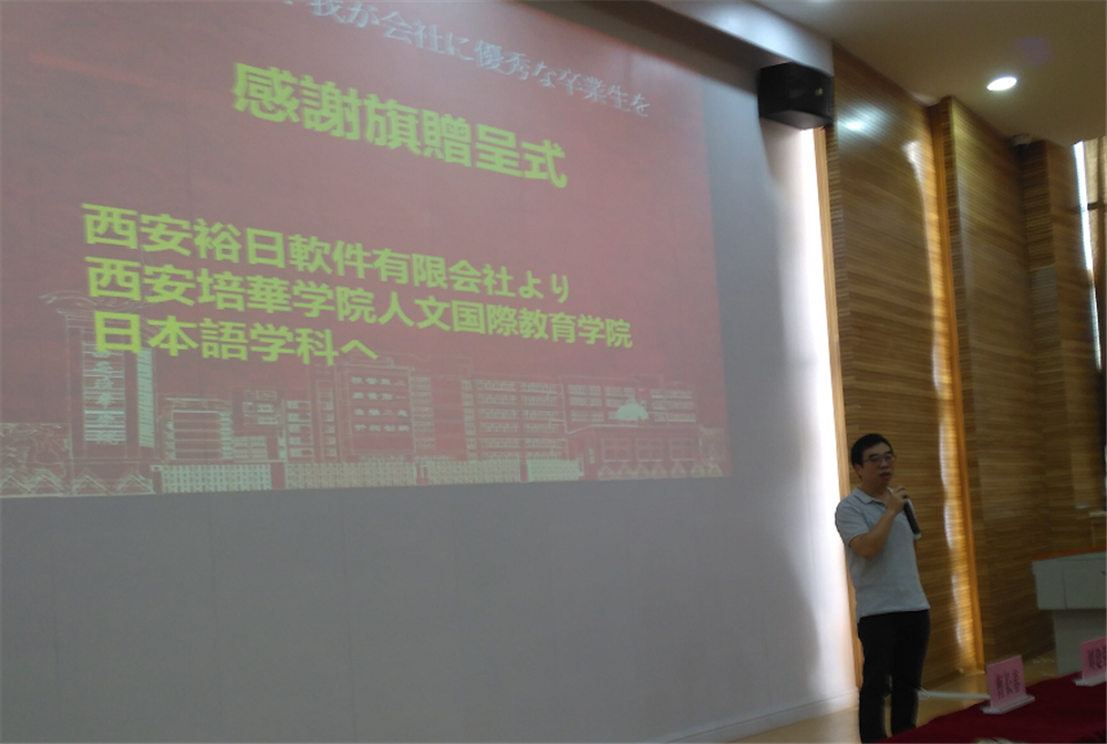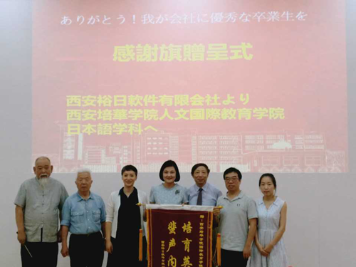 6月7日上午,西安裕日软件有限公司对日直送事业部部长张辉先生专程前来我校,向我院日语系赠送了一面题为“培育英才 蜚声内外”的锦旗。