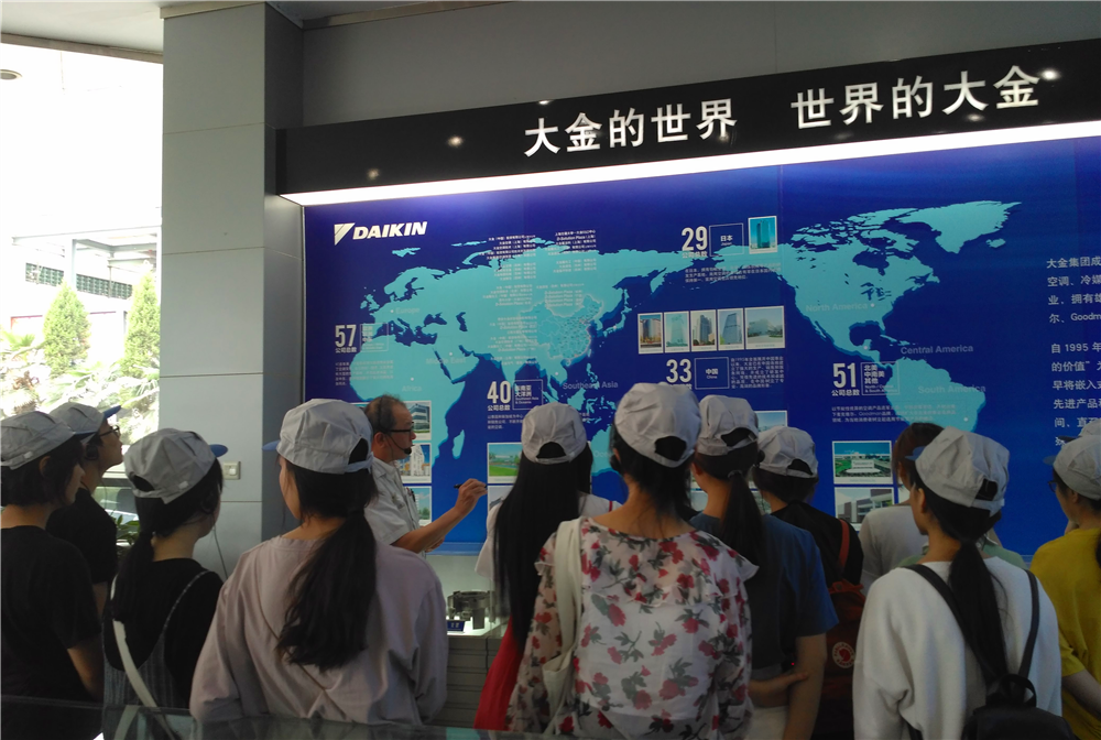 田中总经理首先向同学们的到来表示欢迎,并为同学们讲解公司的业务、产品样品及成就。在展示板上方“大金的世界 世界的大金”这一行文字,显示出大金公司的骄人业绩和声誉。高桥部长带领同学们进入生产车间参观,并向大家做了详细介绍。