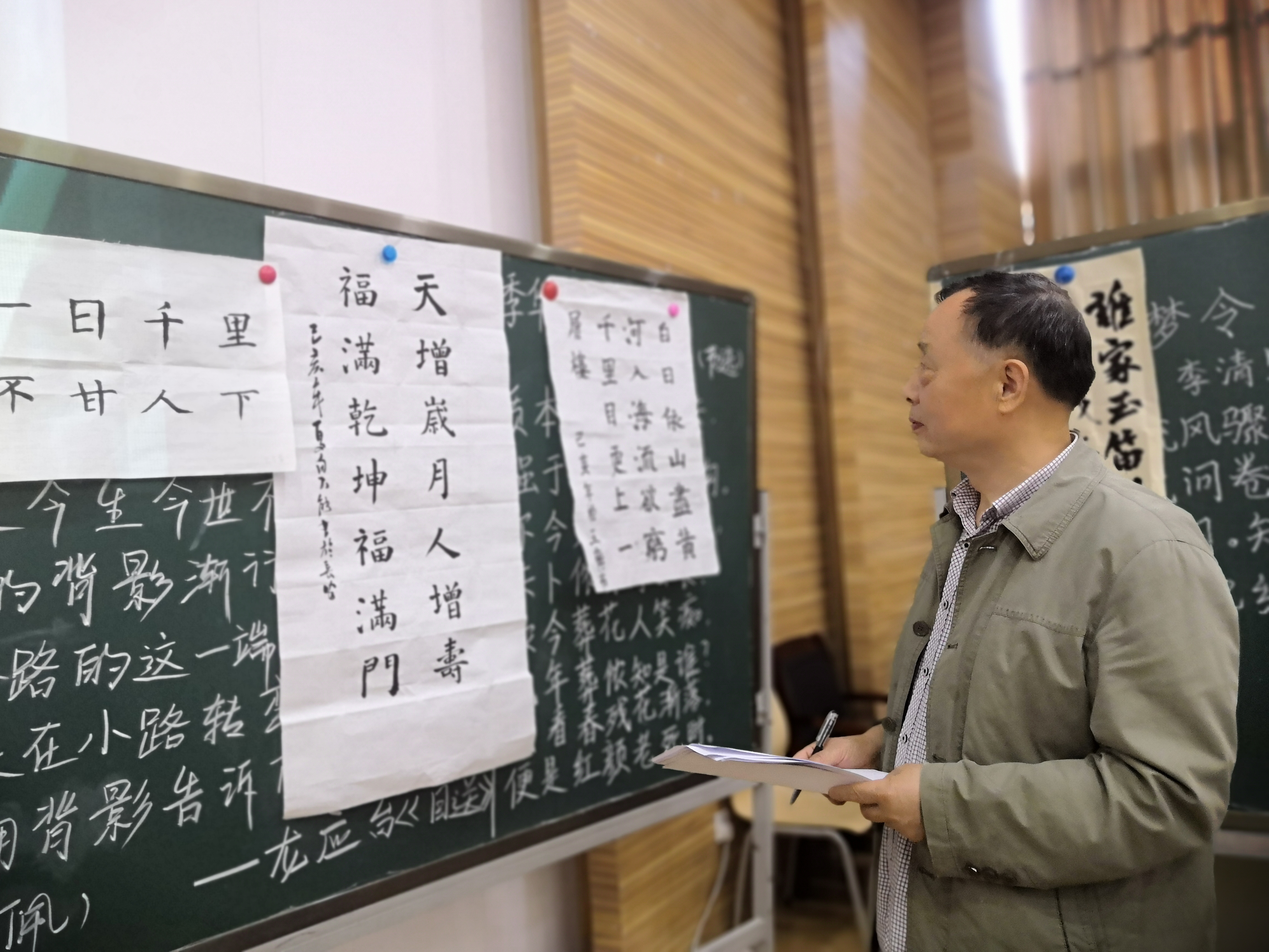 中文系主任张静老师也对作品做了点评,希望同学们好好练字,将来成为一名真正合格的老师。王相民老师亲自上阵,在现场为同学们展示了粉笔字的书写。