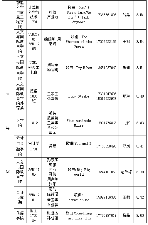 比赛中专业评委老师们认真打分,现场公布成绩,最终评选出一等奖三名、二等奖六名、三等奖九名(名单见附件)。来自人文与国际教育学院英语1803班的徐博辰、林思豪、张博文、余冲、麻欣可、陈星余等同学带来的小品《story of our class》,生动地展现了大学生学习的日常生活,得到评委老师的一致青睐,赢得比赛最高分。