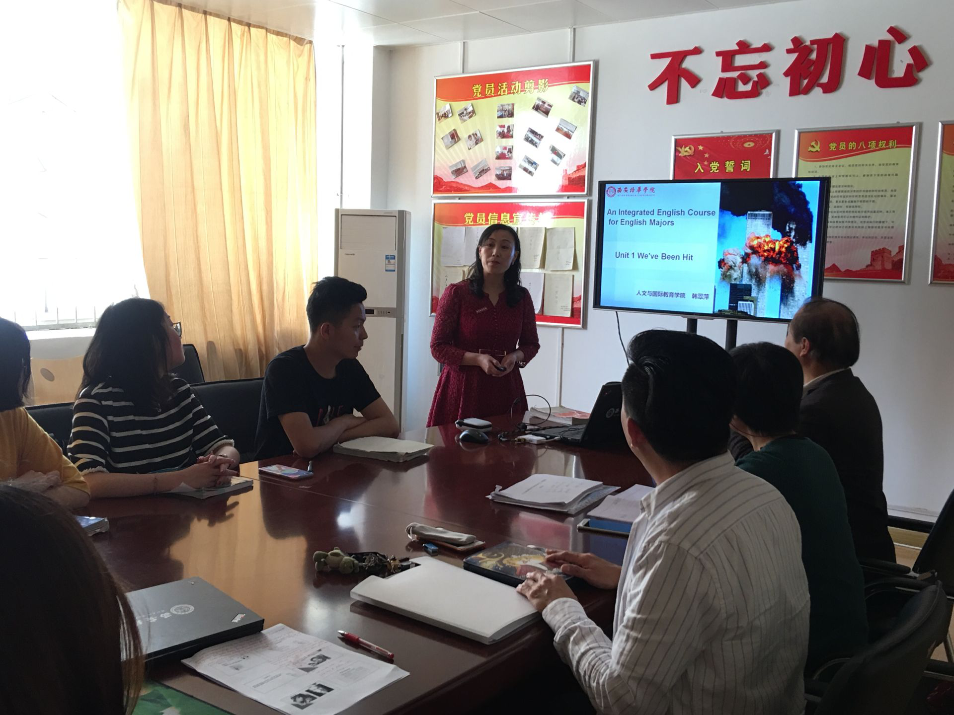 本学期以来,人文与国际教育学院进行了听评课专项活动。作为活动的一部分,2019年5月20日下午两点至四点,我院外语系举行了部分听评课教师阶段汇报会。参加汇报会的有人文与国际教育学院督导组组长甘世安教授、督导组成员王欣荣教授,部分日语专业、英语专业学生等,先后听取了屈江波、韩翠萍、刘云航三位老师的授课汇报。