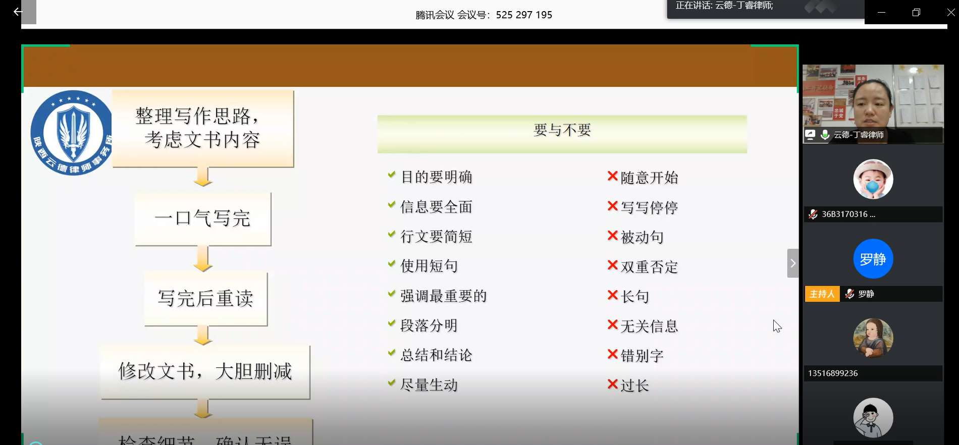 此次系列讲座采取线上讲授的方式,通过腾讯会议平台,由法学系副教授罗静老师主持,诚邀陕西云徳律师事务所的三位律师就各类法律实务工作中常用的法律文书写作方法与学生进行分享交流。