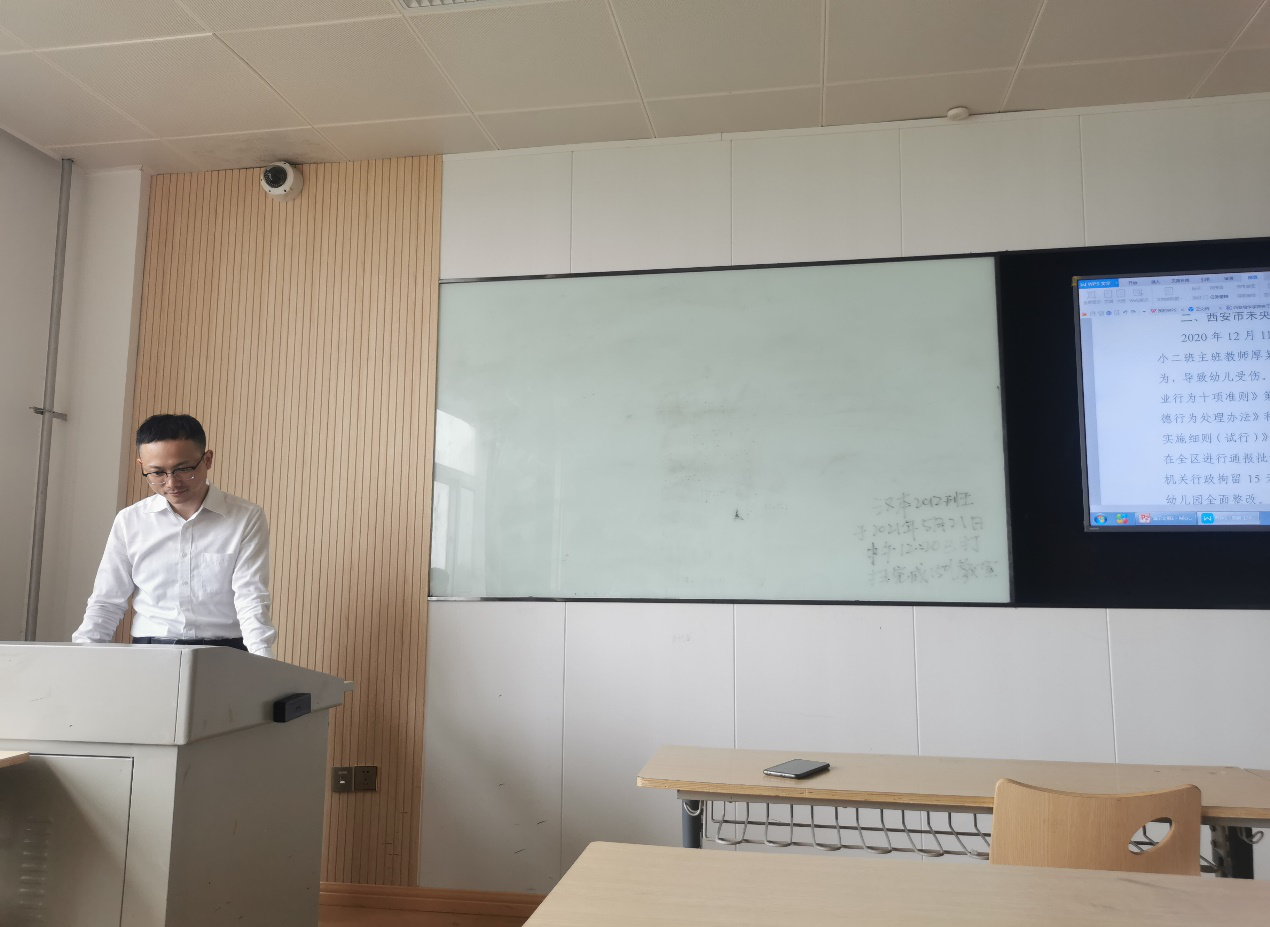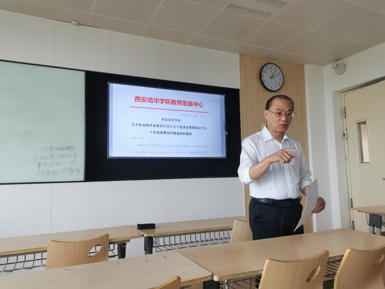 5月21日下午外语系在1501教室集中学习《陕西省教育厅关于对9起违反教师职业行为十项准则典型问题的通报》,学习活动由系主任甘世安教授主持。