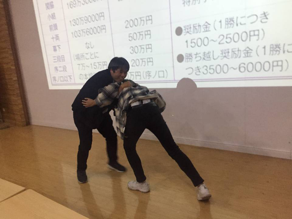 在丰富的多视角的图表和影视材料的印证之下,中嶋老师先后介绍了成为一名相扑选手的资质条件;相扑选手的日常训练和其饮食、装束、发型的特点;相扑选手的等级以及晋级模式和比例,把现场的同学们很快引进了一个精彩且具有严酷激烈竞争精神的相扑世界。图文并茂的PPT屏幕,生动有趣的小插画以及数个生动的相扑比赛画面的视频,让在场的同学们大开眼界。中嶋老师还亲自演示了相扑力士的“押す(推)”和“ぶつかる(冲撞)”的基本招式,并邀请现场的同学上台互动体验。会场里同学认真聆听,气氛活跃。在最后的质疑应答阶段,多位同学举手提问,中嶋老师认真而不失诙谐的解答,使同学们在欢乐的氛围中,对于日本相扑这一传统技艺有了更多的认识和思考,加深了对于日本文化的兴趣和理解。