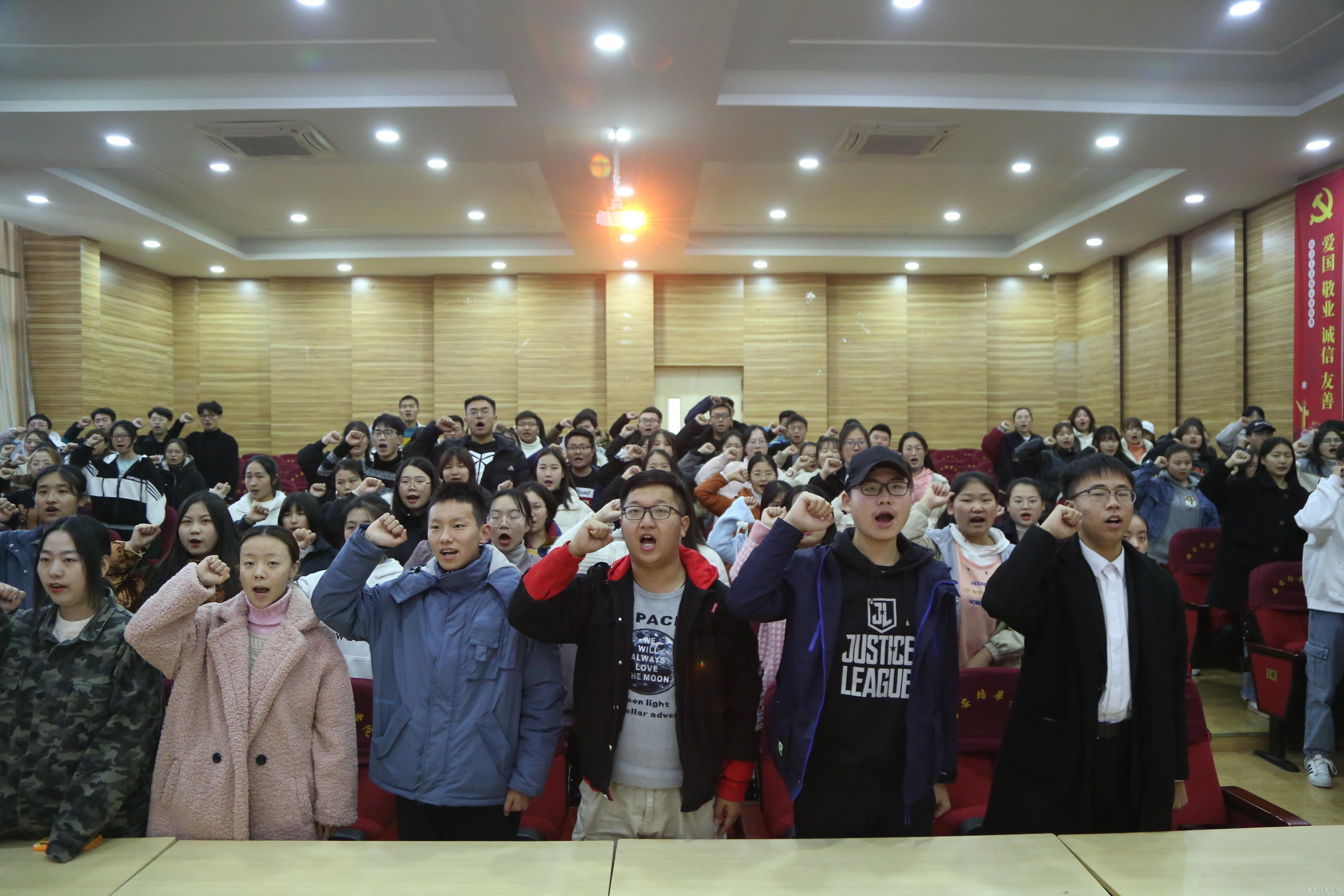 誓词在赵洁老师带领下进行。“我宣誓:我是中国人,我决心忠于宪法和法律,维护宪法权威,认真学习法律知识,增强法律观念,依法行使权利,忠实履行义务,坚守社会正义,维护法律尊严,用我所学服务社会,做一名合格的法律人。“”
