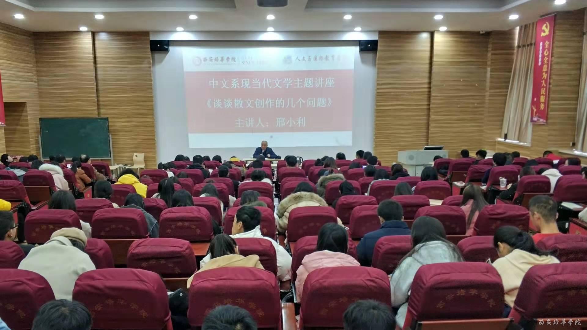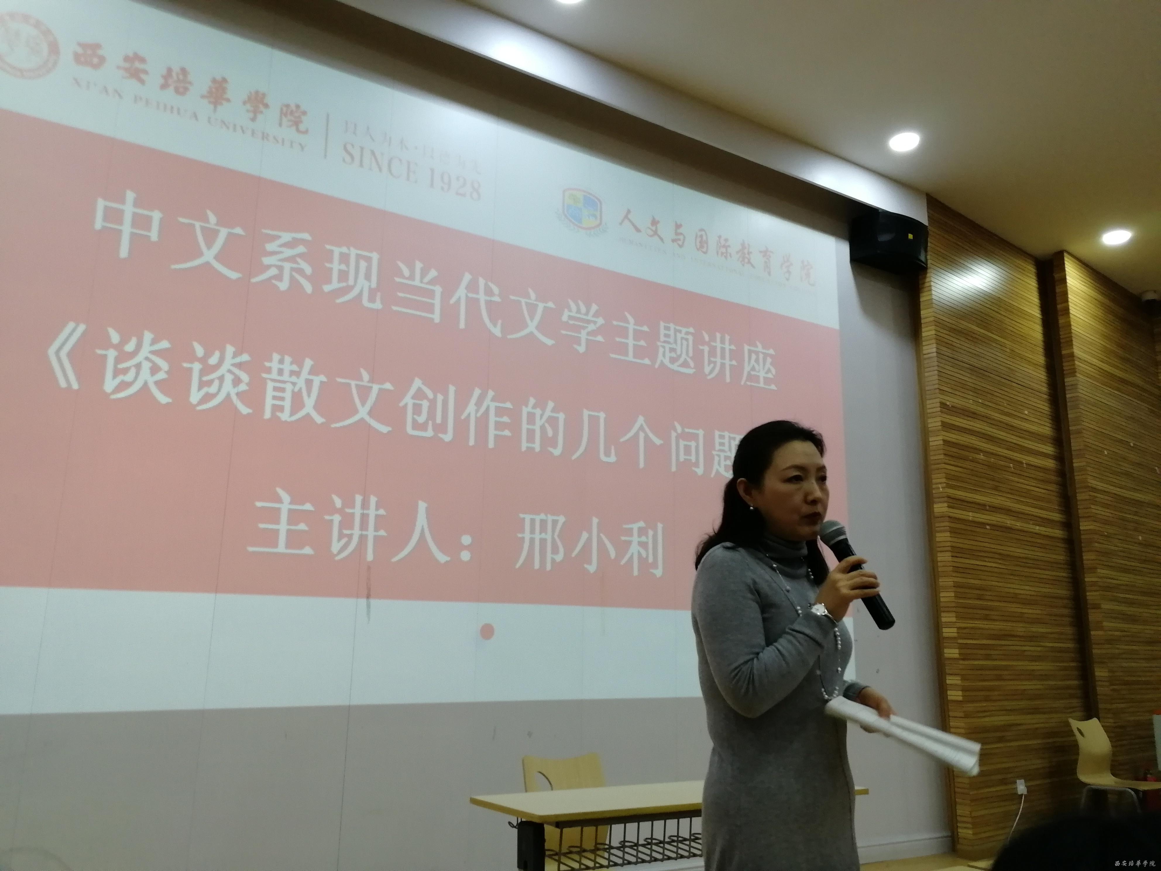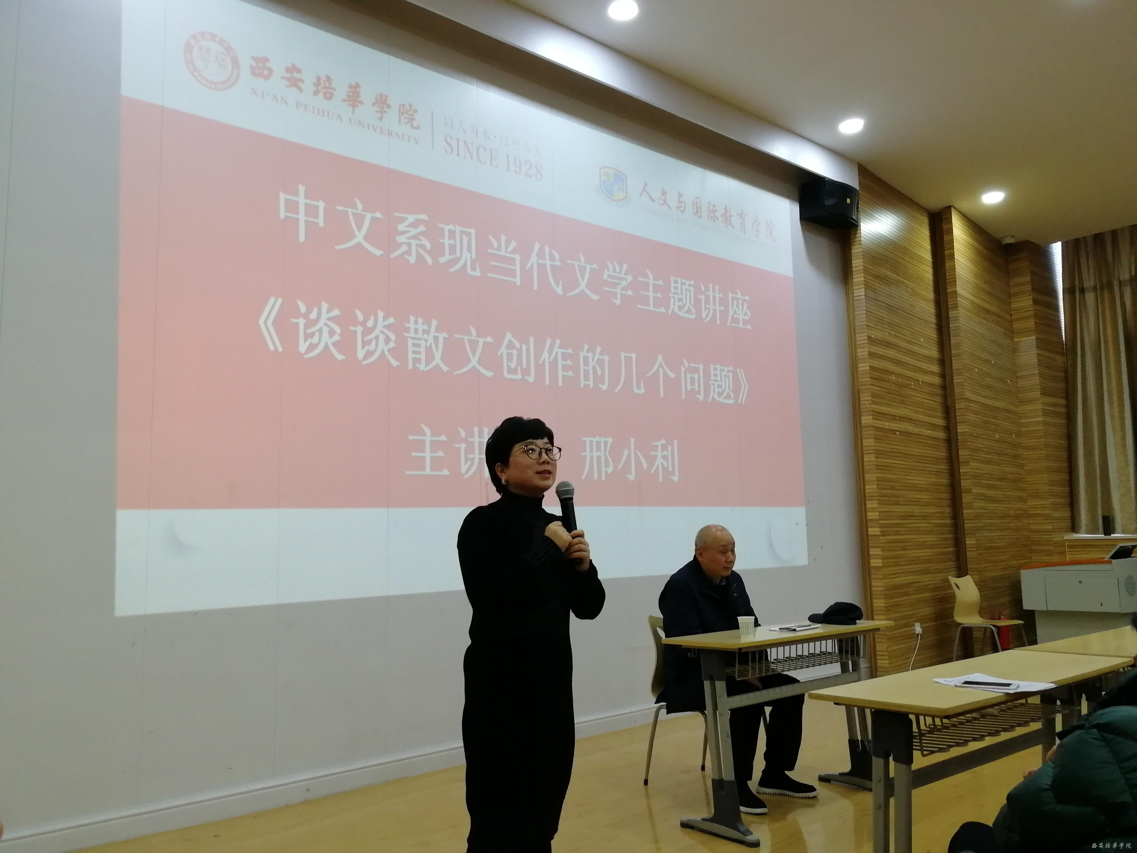2019年11月27日下午两点半,中文系在J101举办了《谈谈散文创作的几个问题》主题讲座,本次讲座由陕西白鹿书院常务副院长、中国书院学会副会长、陕西省柳青文学研究会会长、陕西省散文学会副会长邢小利主讲,中文系主任张静副教授,副主任罗妮、付丽伟老师与中文系全体教师及部分学生代表参加了此次讲座。