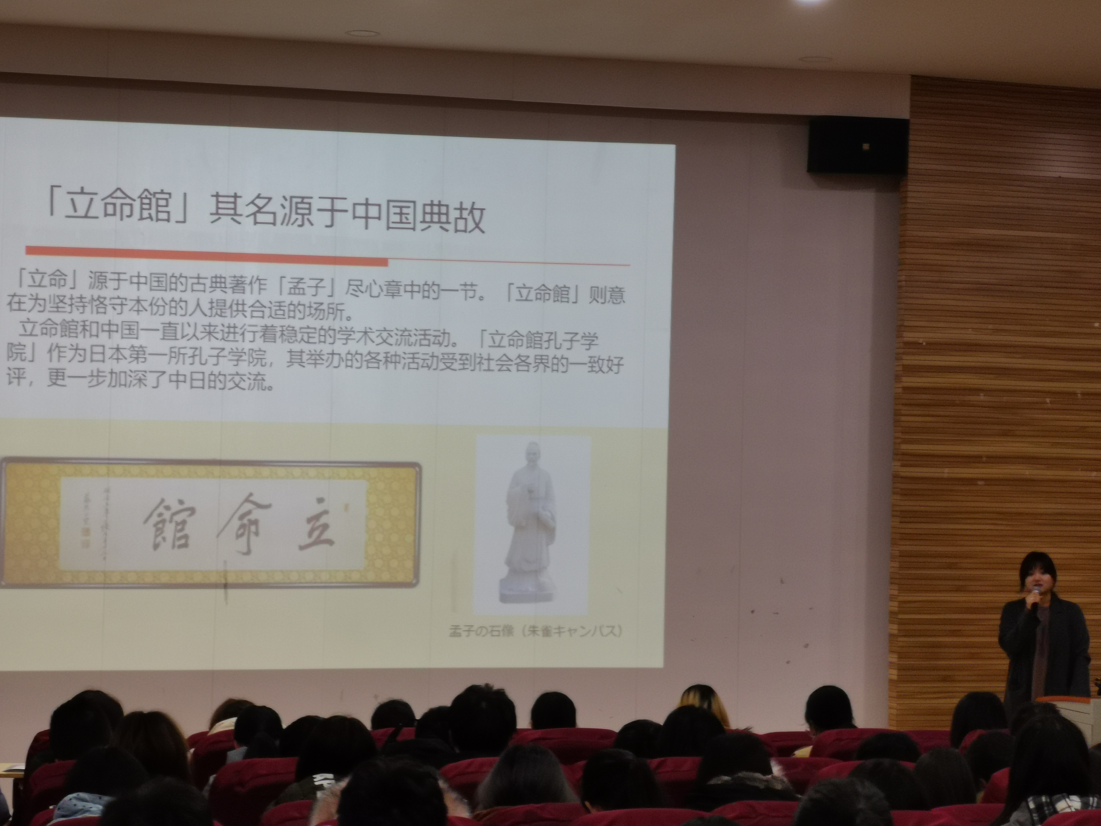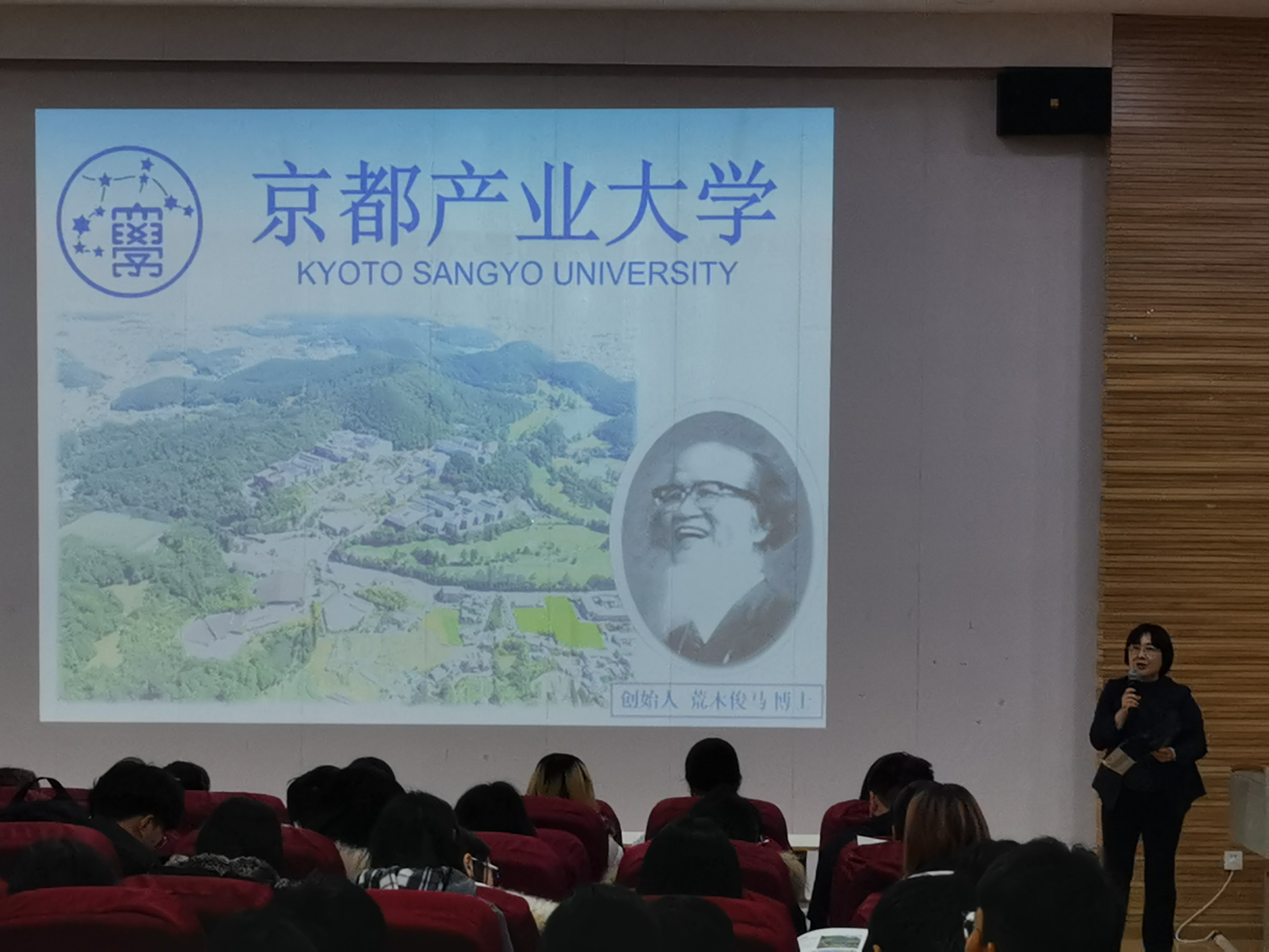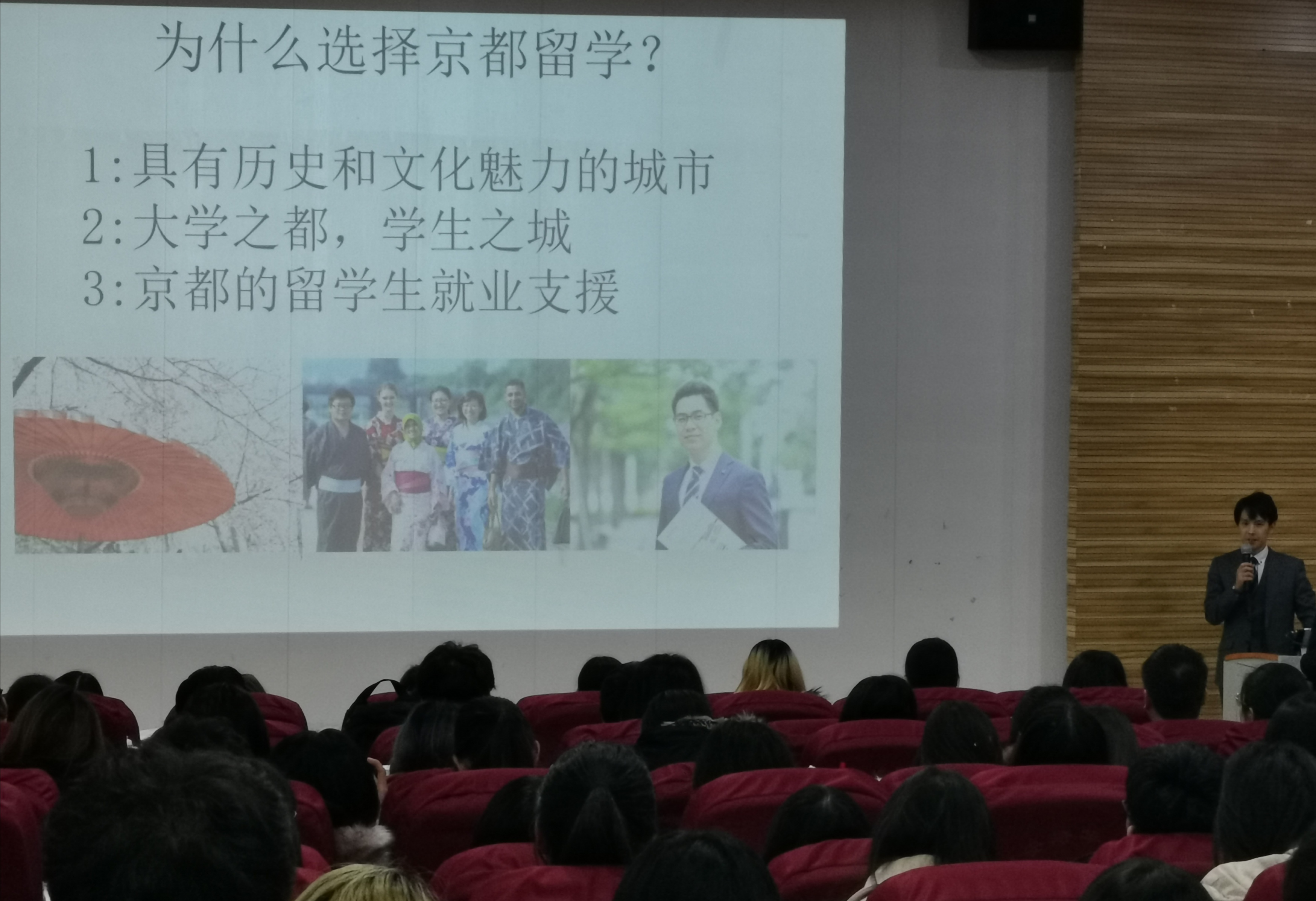 片刻休息之后,15点30分中日双方与会人员移步说明会场。在那里等候的日语专业的同学以热烈的掌声欢迎来自日本京都高等教育界的客人。说明会在刘建强教授的主持下正式开始。岩松义秀首先致辞,向我校领导和老师以及全场的同学们表示欢迎和感谢,随后,由国际事业部的丰田亮天先生,以PPT丰富的画面介绍了日本古都京都具有的历史文化以及与古长安的文化渊源和当今作为人文、学问之都的独特魅力。随后,京都产业大学、京都立命馆大学、京都造型艺术大学的代表依次登台,以具体丰富详实的内容和画面讲述了各自大学的办学历史、现状和特色,尤其是在留学生教育方面的成就。在场的同学们,对于能够带来临场感的多视角下的介绍内容,表现出了浓厚的兴趣,不时报以掌声予以回应。