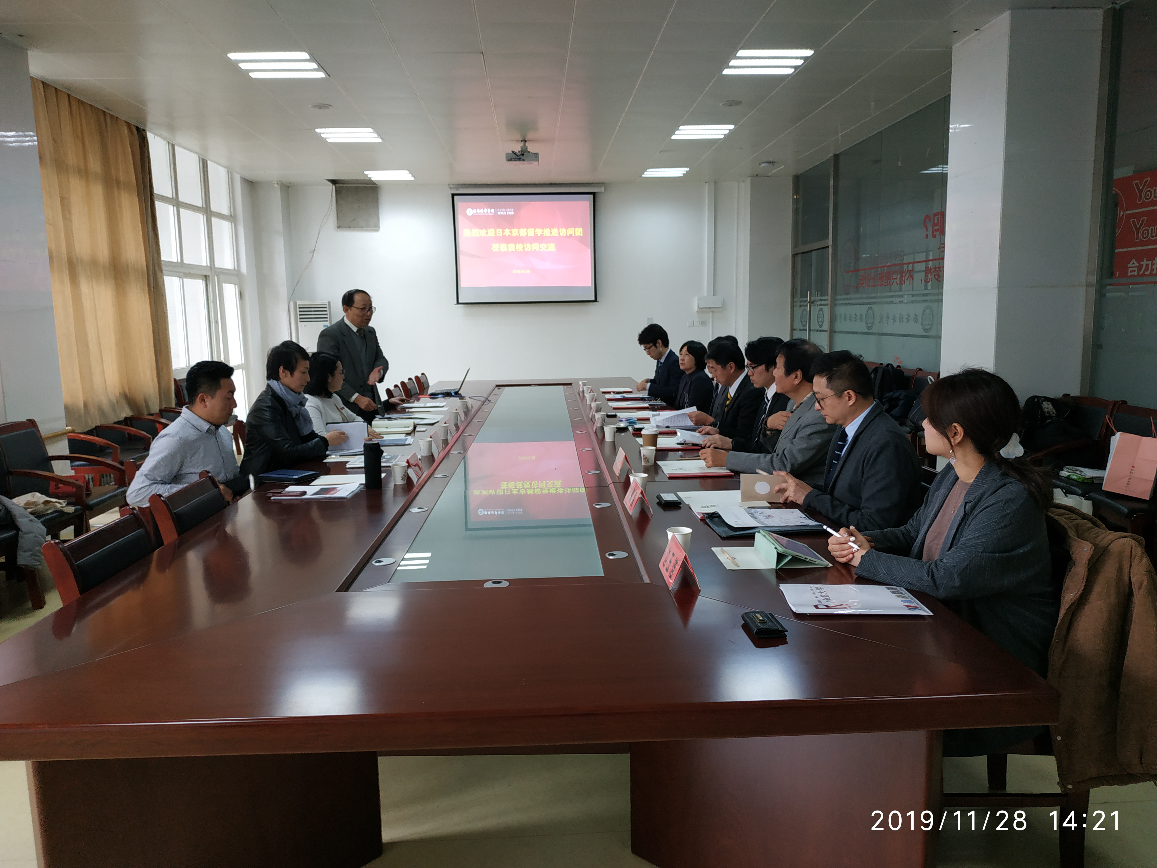 11月27日(周四)下午京都府大学留学联合推介访问团一行,在京都府国际课参事岩松义秀先生的带领下来到我校,与学校国际交流中心领导以及我院外语系日语专业教师会面座谈。会后又举行了针对日语专业学生的留学说明会。