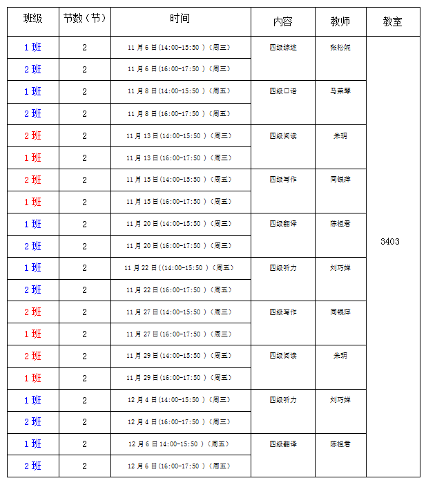 本培训从11月6号开始到12月6号为学生们免费开展四级培训的学习。为了能让大多数学生都能参加培训,现将时间安排在每个周三和周五下午为大家讲解四级考试的方法、答题技巧和答题注意事项。具体课程安排如下: