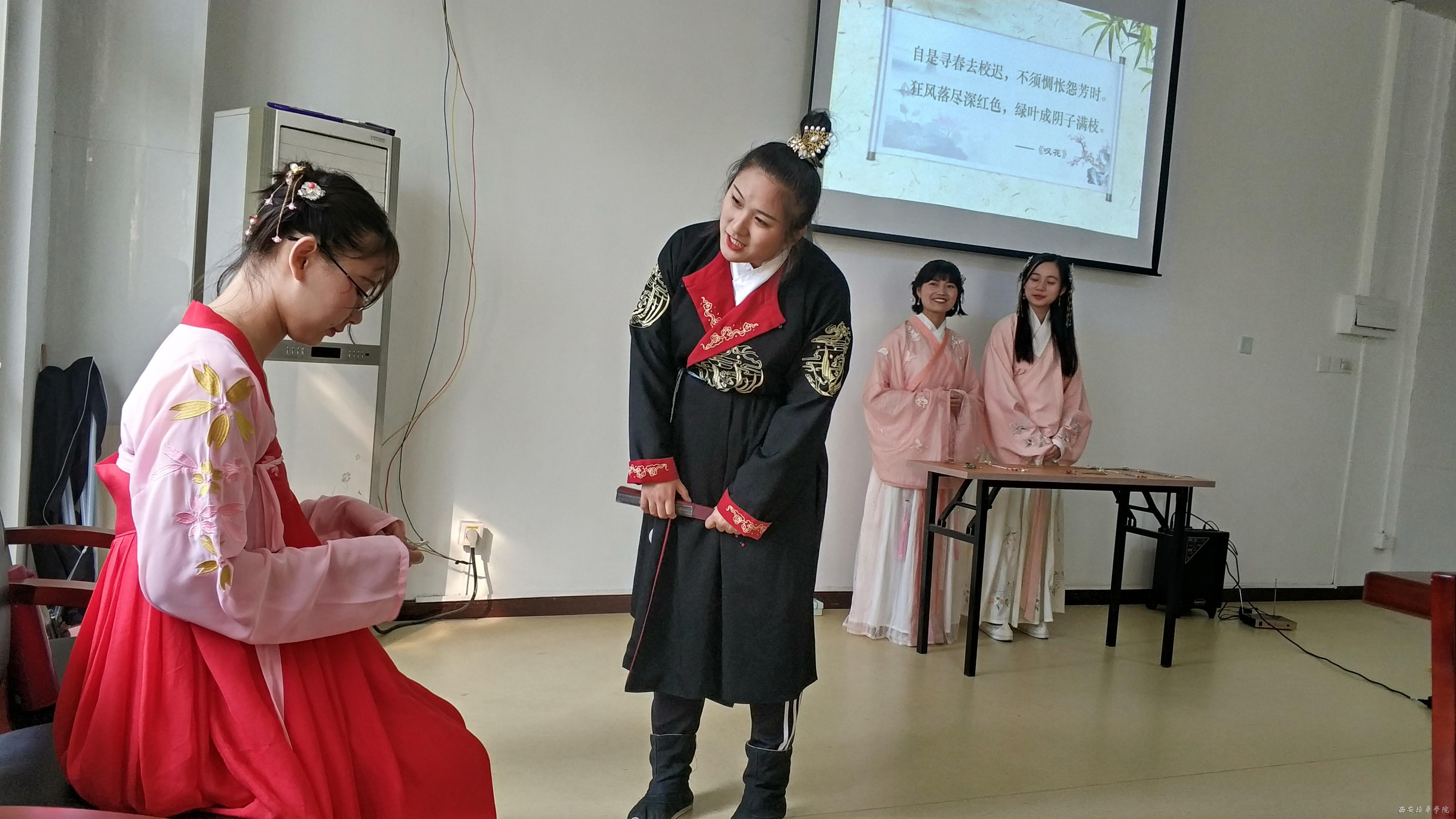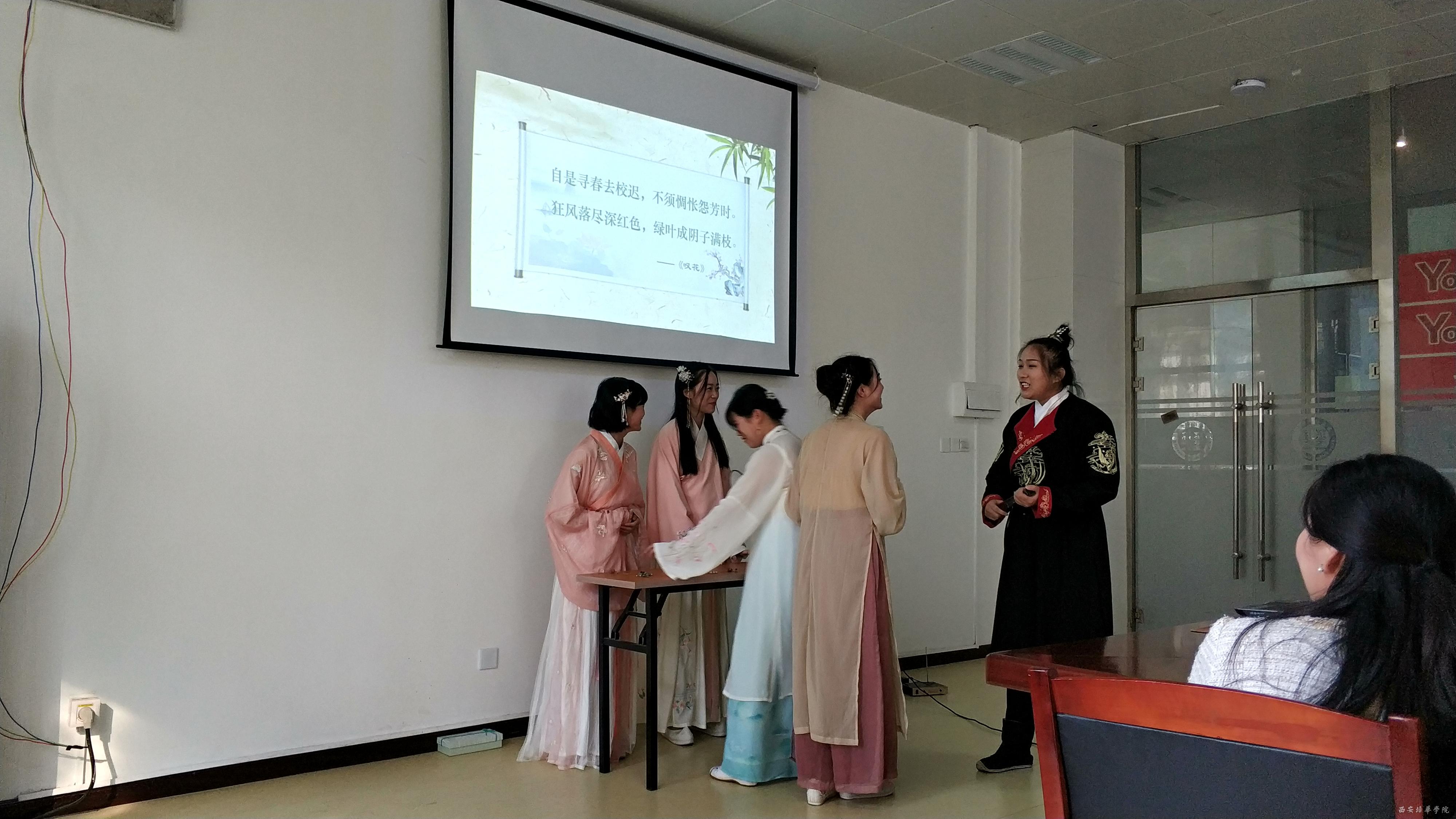 此次活动首先由“汉服断代”与“投壶游戏”进入热身阶段,以情景演绎的新模式让参与代表亲身体验,感受传统文化的综合魅力。其次中文系申艳霞老师带来的《中华文化文字体验》,以视频导入的方式,述了汉字的演变中的“”象形“”与“”会意“”部分。与会代表积极参与“识文断字”游戏环节,再现教学环节中的课堂互动,极大促进了教学环节的提升。紧接着由王中俊老师分享了中华唐诗文化体验环节,他另辟蹊径以杜牧的“”叹花“”诗作品导入并以现场扮演等方式引人入胜,探究作者的心路历程,在不知不觉中感受到了唐诗的意蕴之美。最后,由陕西省社科院博士、助理研究员王晓勇老师以通俗易懂,妙趣横生的语言分享了“大唐盛世的三大要素”。他以时下流行易于接受的电视剧《长安十二时辰》导入课程,内容指出“大唐盛世的主要成因在于多元的宗教、开放的民族与全方位的文艺”。他娓娓道来将讲座气氛推入高潮,引起强烈的共鸣,进一步再现了应用技术型转型过程中的课程改革新路径与新方法。