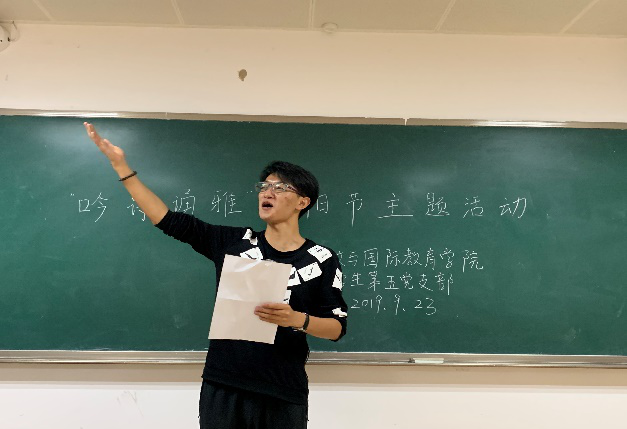 2019年9月23日,人文与国际教育学院学生第五党支部在1406教室开展“吟诗诵雅”重阳节主题活动。旨在不断锤炼党性,号召党员干部要带头继承发扬优良的传统文化,守住传统节日的文化精粹,防止一切腐朽思想侵蚀。