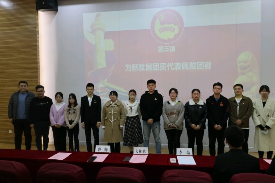 朱林鹏老师、李晶老师和曹帅老师为新发展团员代表佩戴团徽,合影留念