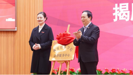 常务副校长胡俊生与人文与国际教育学院常务副院长梁蕊为法律服务中心揭牌。