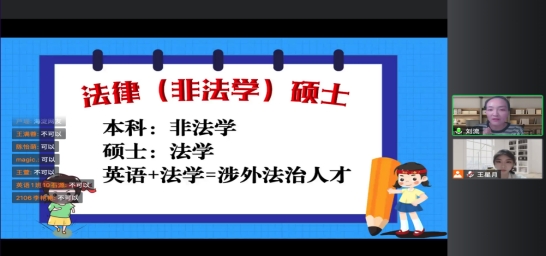 随后,刘流博士向同学们介绍了法律硕士的相关内容。法律硕士指本科为非法学但是硕士为法学,对于英专生来说就是“英语+法律=涉外法律人才”的强强联合。刘流博士也向同学们罗列了考法律硕士(非法学)的优点,最大最吸引人的莫过于不用考数学;其次,法硕的就业范围较广,无论是考公、事业单位、国企还是外企都需要法律人才。