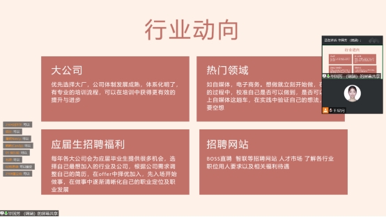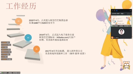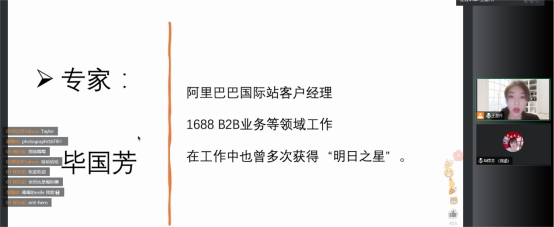 2022年12月11日晚19点至21点,外语系英语专业职业生涯规划与就业指导系列讲座第四场于线上举办。本次研讨会由阿里巴巴国际站客户经理毕国芳主讲。毕女士曾在1688的B2B业务领域工作,在工作中曾多次获得“明日之星”等荣誉称号。毕女士主要为同学们介绍了在电子商务及外贸领域的就业情况,并为同学们如何做好未来就业准备做出了指导。本次讲座由外语系英语专业教师王星月主持,英语专业21级全体学生参加。