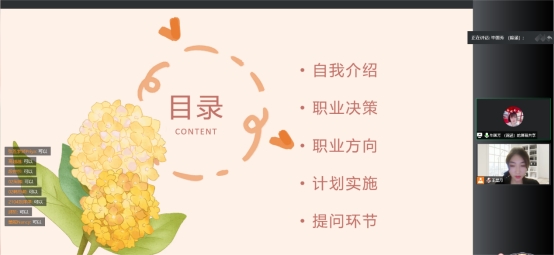 讲座中,毕经理重点围绕“自我介绍、职业决策、职业方向,和计划实施”等四个方面展开讲解。毕经理结合自己的求职及工作经历,并就在大学期间进行的职业尝试、证书考取、工作地点选择与职业规划方面进行了详细介绍。毕女士强调,同学们切忌好高骛远,眼高手低,行动永远比语言更加关键。要先选定方向进行尝试,才能知道此方向适不适合自己。她告诫同学们,一味地空想和纠结只会耽误计划的实施。