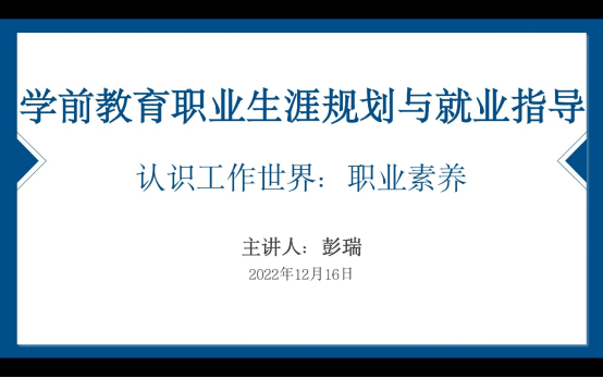 为不断深化产教融合、校企合作,满足学生就业需求和工作岗位的客观需要,人文与国际教育学院学前教育系于2022年12月16日-2022年12月20日,围绕《职业生涯规划与就业知道(二)》“探索工作世界”相关内容,对2021级本、专科共计426余名学生展开系类教学讲座。讲座由学前教育系栾博强副主任、学前教育系郭宇涵副主任、学前教育系教师王增智、王旭红、彭瑞、何伟、王璐露老师共同参与讲授。