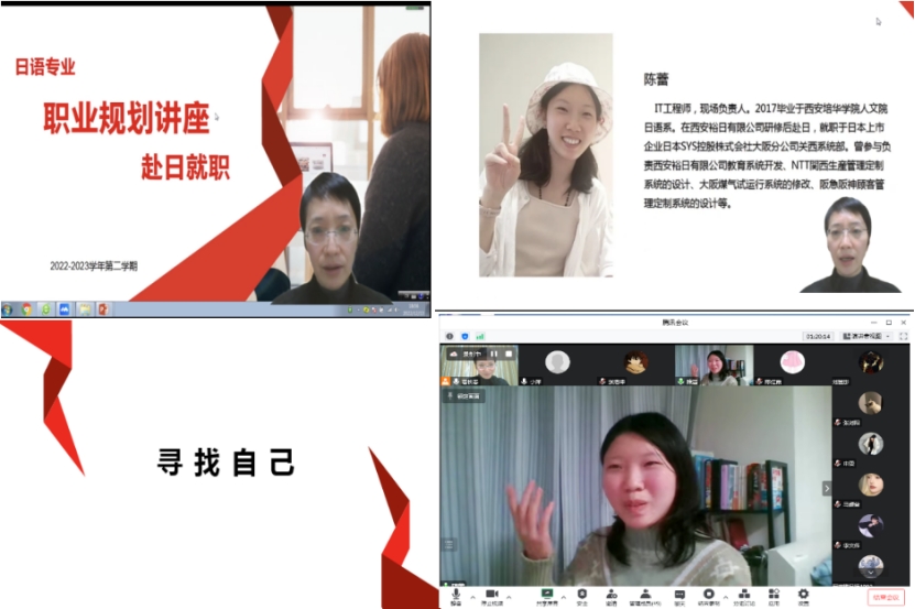 人文与国际教育学院外语系日语专业分别于2022年12月12日19:00—21:00,和13日19:00—21:00在腾讯会议平台召开了两场职业规划云端系列讲座。这两场次讲座的主讲人分别为日语专业15届毕业生张丽敏经理和17届在日工作的毕业生陈蕾女士。参加本次讲座的是日语专业的教师和21级至19级的同学们。