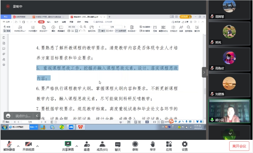 胡老师对期末和寒假审核评估相关工作进行了安排。胡老师指出,针对2023年的审核评估工作,学校和学院高度重视,各位老师要进一步强化大局意识、责任意识、团队意识,以此次审核评估工作为契机,进一步规范日常教学、科研、管理工作,建立系统且长效的机制,促进我系教育教学的健康持续发展。随后,胡老师对审核评估部门及人员工作职责的相关通知进行了详细解读。老师们应从教学科研、师资队伍、学生管理、党建思政等方面,以人才培养为中心,加快“地方型、应用型、开放性”的专业特色塑造。