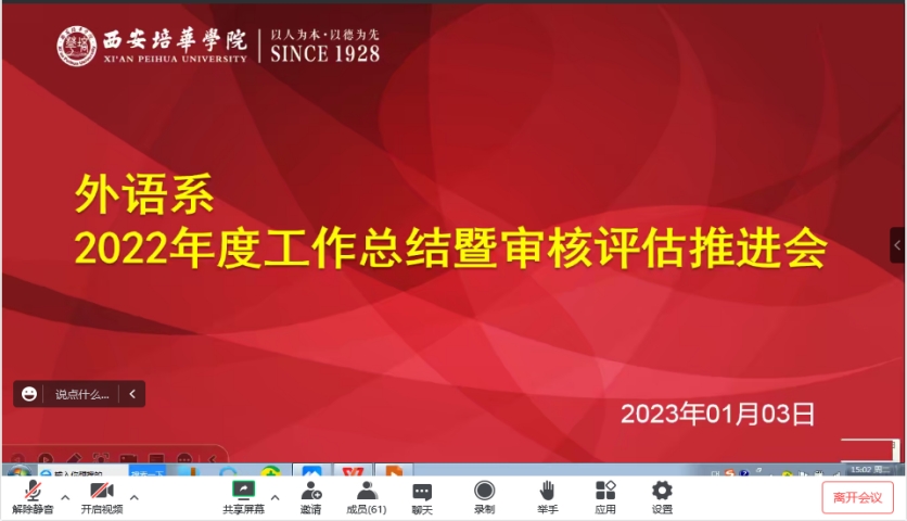2023年1月3日下午,外语系于线上召开2022年度工作总结暨审核评估推进会。外语系主任胡小花副教授、副主任曹长春副教授、副主任周萍老师、大学英语课程负责人贾梦琦老师及外语系全体教师参加会议。外语系副主任曹长春副教授主持会议。