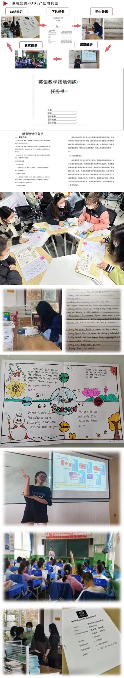 课堂教学将秉承陶行知先生“教学做合一”的理念,将按照“自主设计、发现问题-案例感悟-理论梳理-微格训练-尝试应用-反馈修改-再次实践”的微格训练模式展开,要求学生在“先做后学,以学定教,学后再做”的教学思路中,基于中小学真实英语课程帮助学生训练、发展和提升教学实施技能和作业与练习设计技能。其中学生能够使用正确的语音语调准确、表情动作丰富地表演英语歌谣、英语故事以及课本剧,应用jigsaw,running dictation等多种方法进行课堂教学技能实践活动。