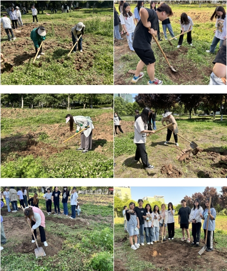 辅导员也亲身上阵加入到学生队伍当中,向学生普及农具的使用方法和注意事项,在实践的过程中同时确保安全。学生分区域进行土地的翻新,大面积旧土露出了深层湿润的泥沙,进行热火朝天的劳作。